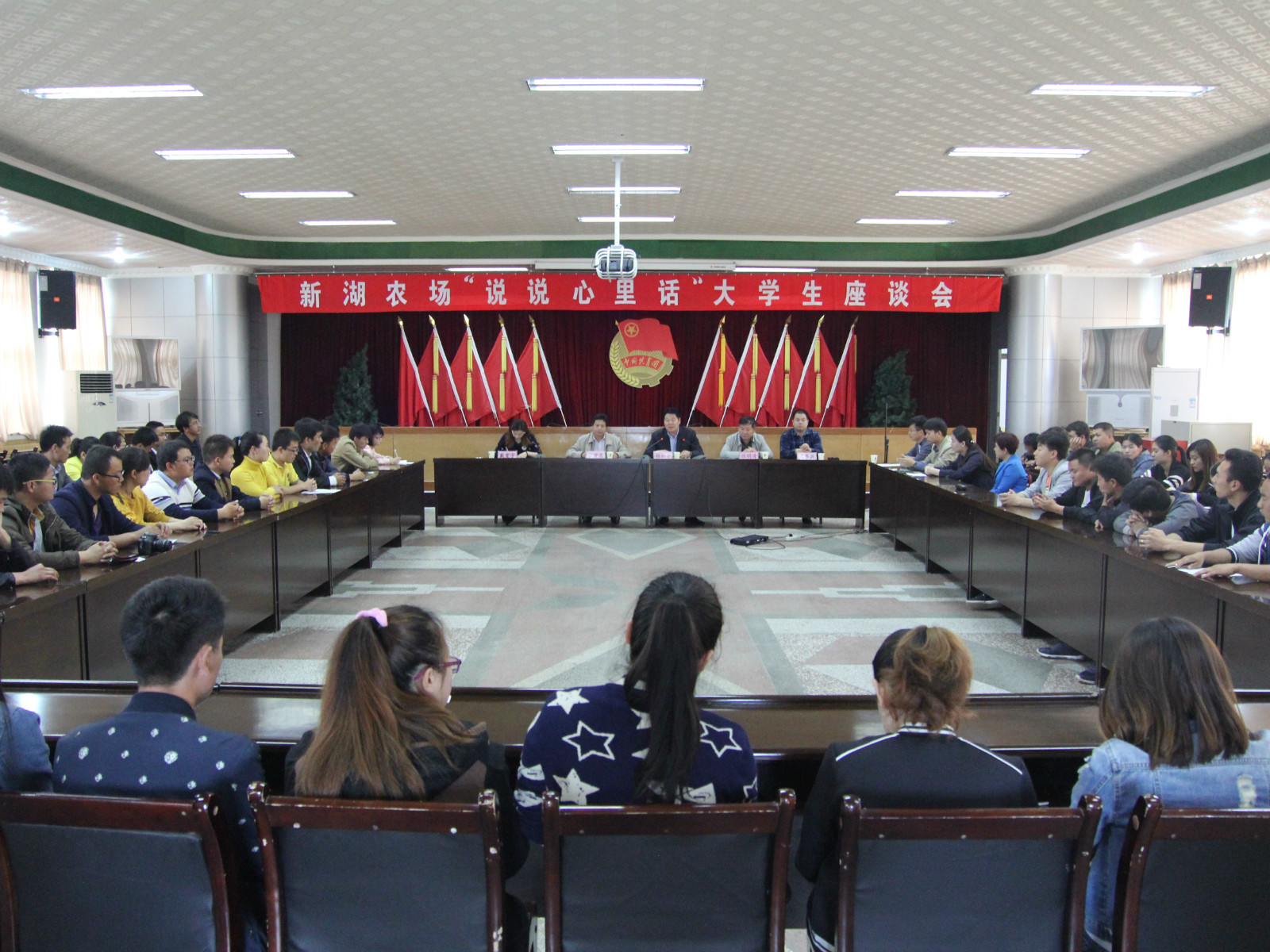 5月5日下午,由农场团委组织的新湖农场“说说心里话”大学生座谈会在新湖农场机关5楼会议室顺利召开。农场领导对此次座谈会给予了很大关注,农场党委常委、副政委杨新平同志;农场纪委副书记张明清;农场政工办主任王务兵;农场团委书记戴雯宇;农场行办主任张晓东出席了座谈会,来自新湖农场各单位的大学生代表90多人参与本次活动。
