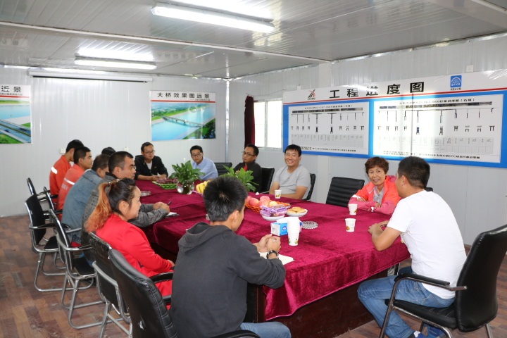 在105团-新湖农场公路建设第一合同段项目部,吕伟书记和王新豫主席首先代表公司对节日期间仍奋战在一线的员工表示慰问,祝全体员工及家人中秋节快乐。随后吕伟书记听取了项目经理关于该工程的前期准备工作和驻地建设的介绍,对项目部在经营管理、精神文明建设、员工精神面貌等方面的工作亮点给予了肯定,同时指出:一是项目部党支部要准确把握党建工作在生产经营管理中的切入点,发挥好党员先锋模范作用和党组织战斗堡垒作用,要切实抓好思想建设和组织建设,加强党务知识学习,提高党员整体素质,增强党组织的战斗力;二是要引领党员干部在节能减排、降本增效、市场拓展等生产经营工作中建功立业,激发全体员工爱岗精神,为公司在“十三五”的发展提供坚强保证;三是中秋团圆节全体员工仍奋战在工作一线,项目部要做好节日期间对员工的的慰问及维稳工作确保项目部安全。