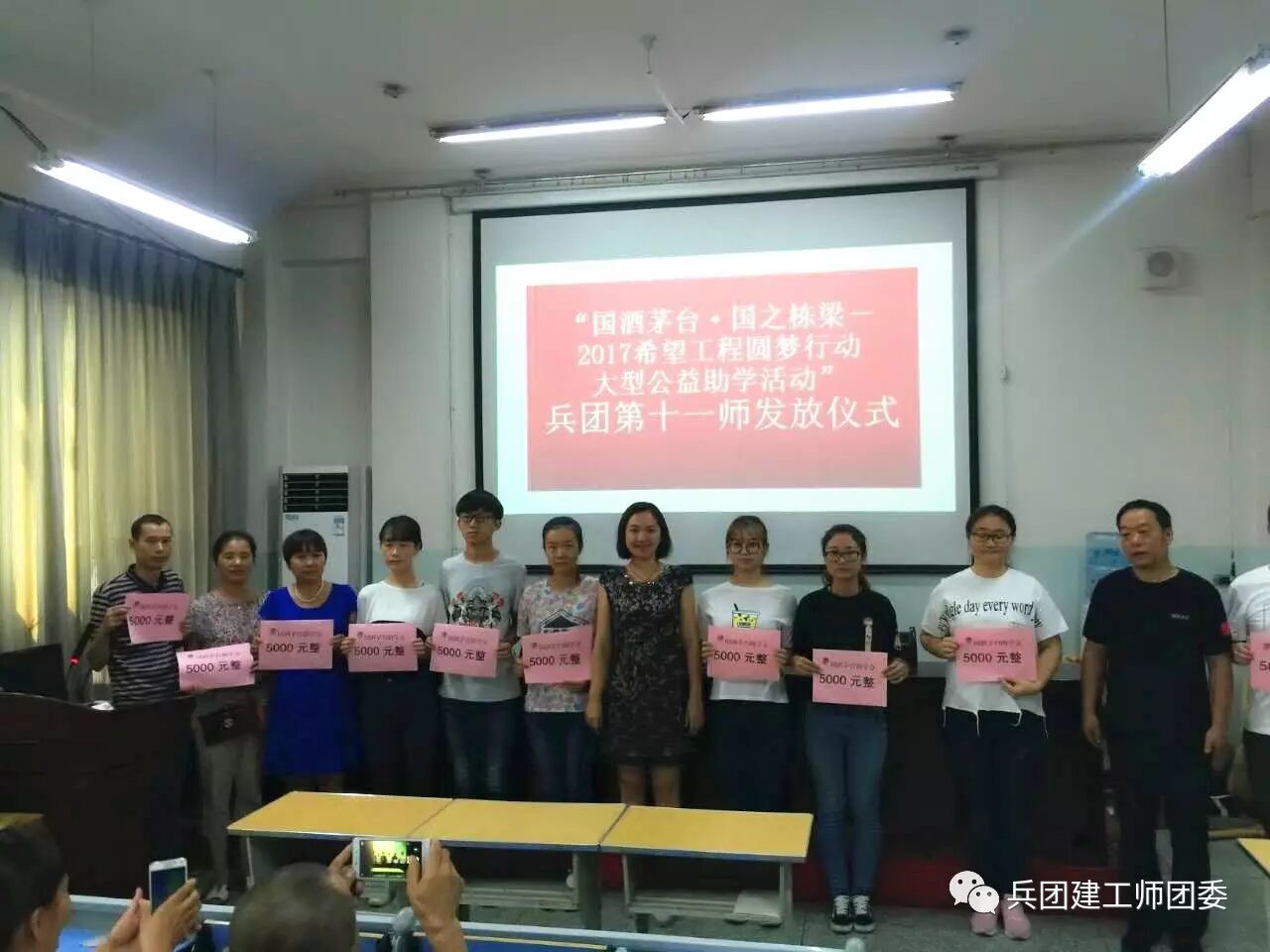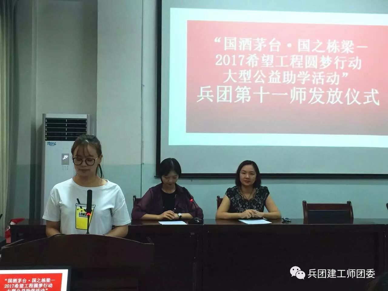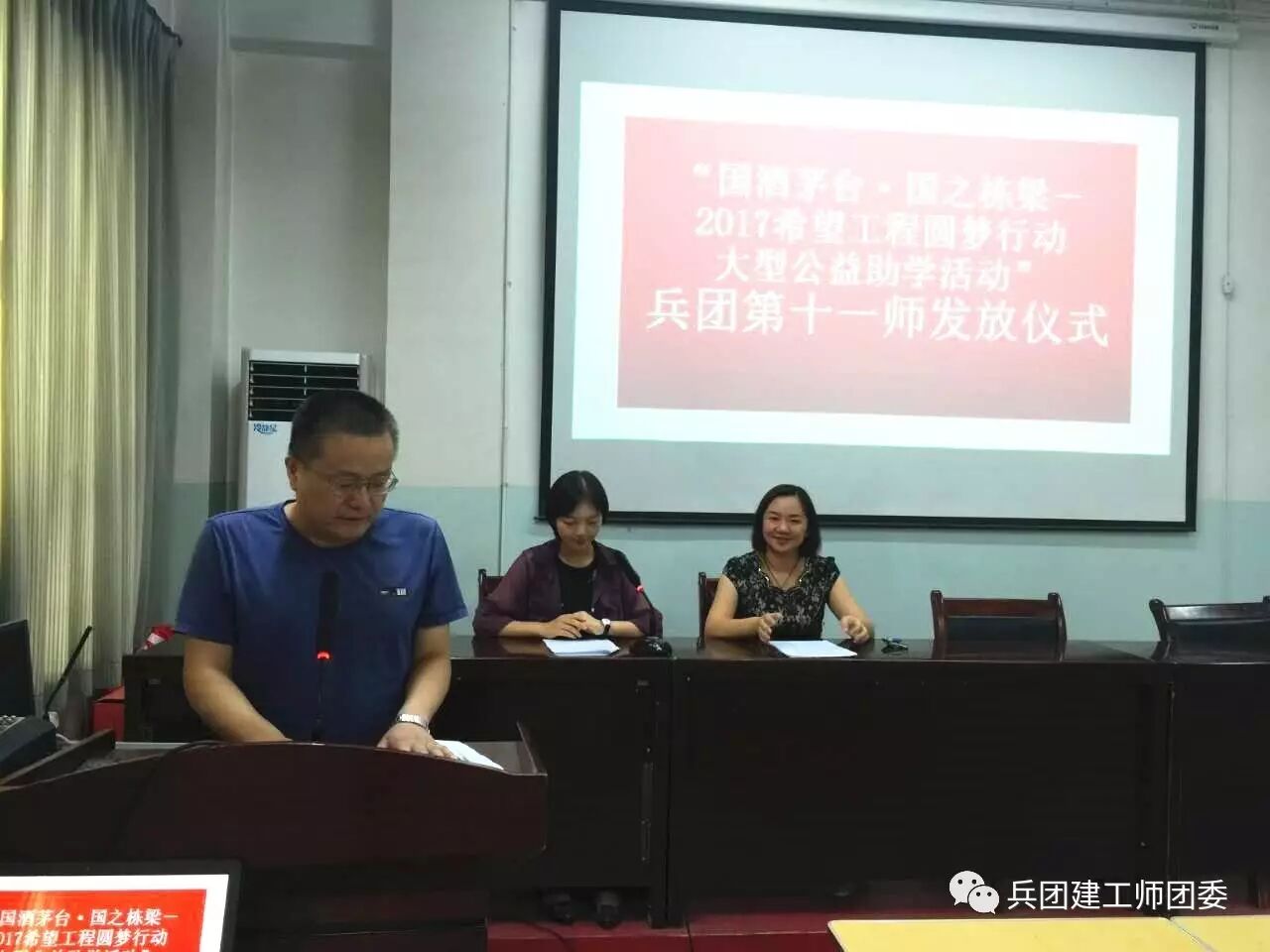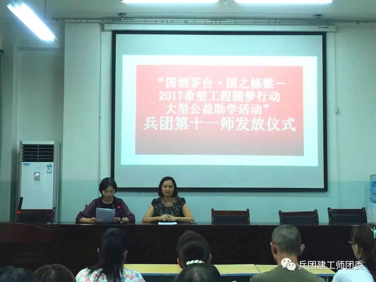 8月31日,“国酒茅台·国之栋梁--2017希望工程圆梦行动大型公益助学活动兵团十一师发放仪式”在师职业技术学校实训楼3楼会议室举行。师团委书记席菲出席本次发放仪式,受助学生及家长参加了本次活动。