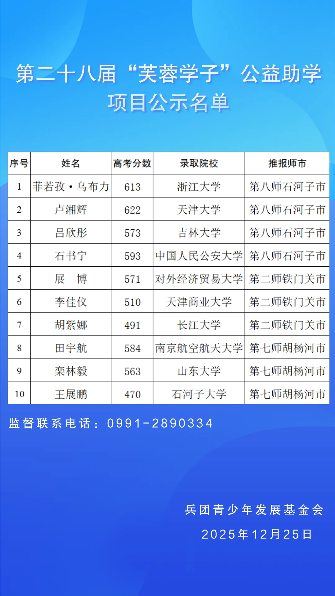 根据第二十八届“芙蓉学子”公益助学项目学生资助标准及选拔条件,通过学生本人申请,经师市团委初审,兵团青基会复核,拟资助以下 10 名学生。现将名单公示如下,公示期为通知发布日起至2026年1月1日。