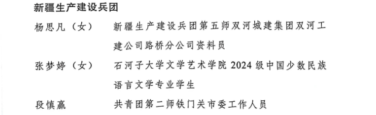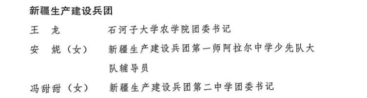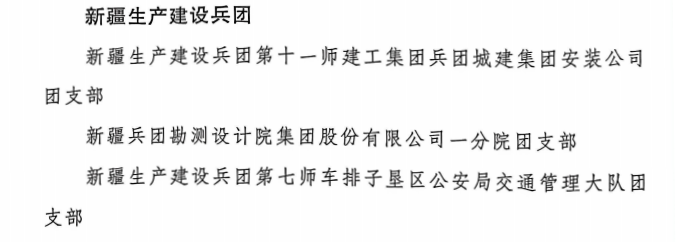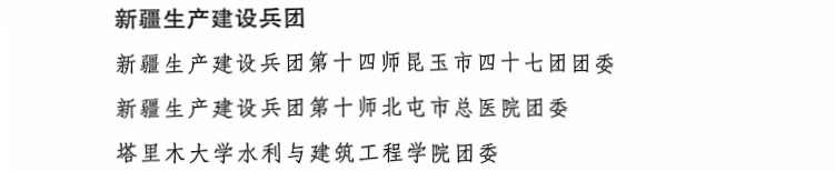 近日,共青团中央印发《关于表彰全国五四红旗团委(团支部)、全国优秀共青团员、全国优秀共青团干部的决定》,授予348个团组织全国五四红旗团委称号、342个团组织全国五四红旗团支部称号、451名同志全国优秀共青团员称号、344名同志全国优秀共青团干部称号,其中,兵团共3个团委、3个团支部(团总支)、3名共青团员、3名团干部获奖。