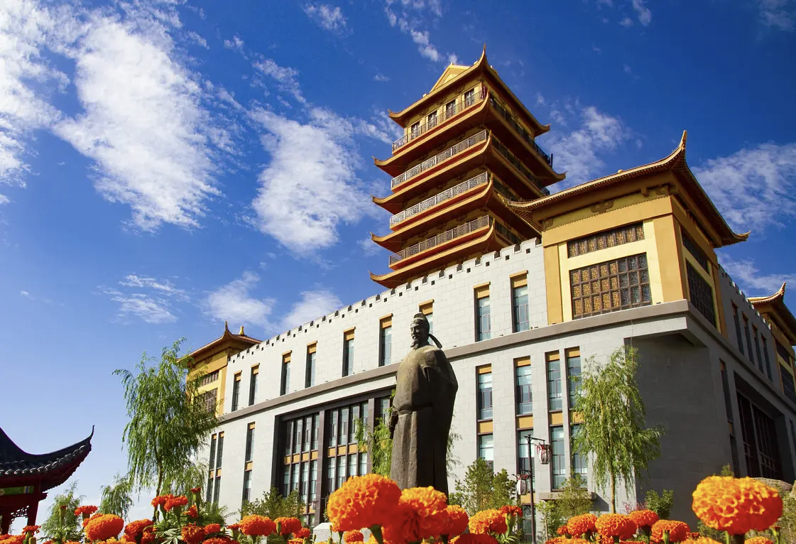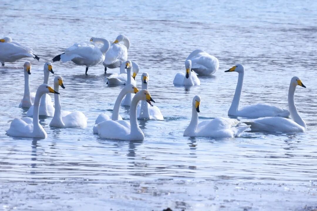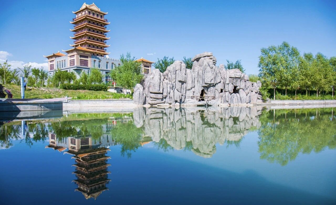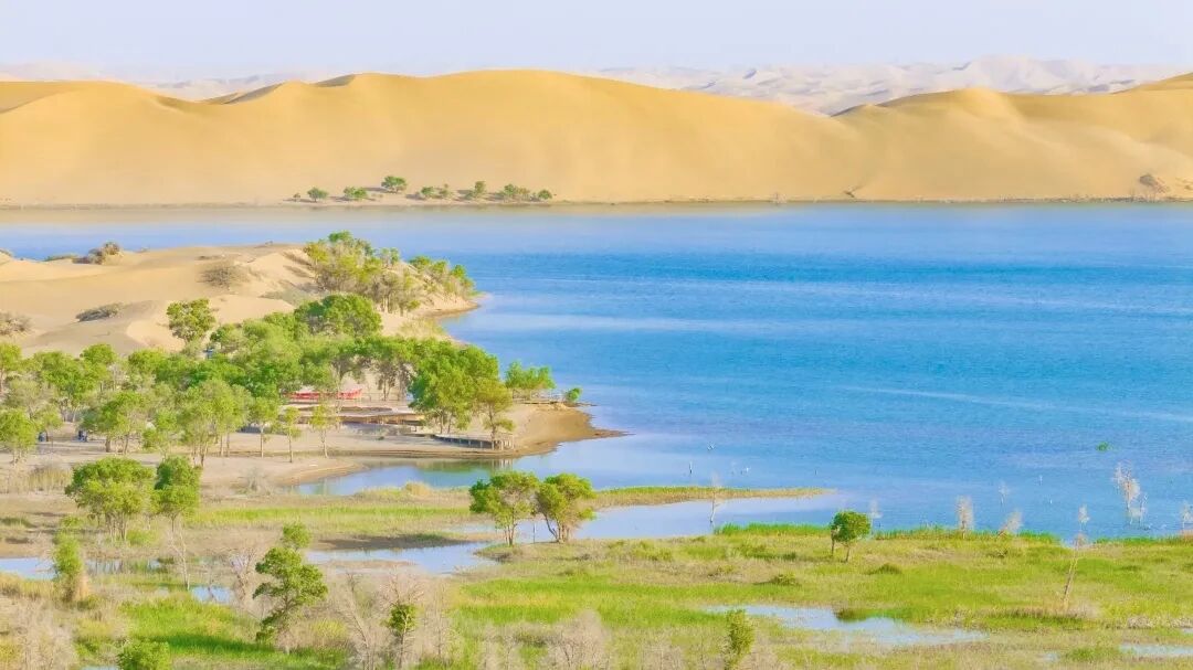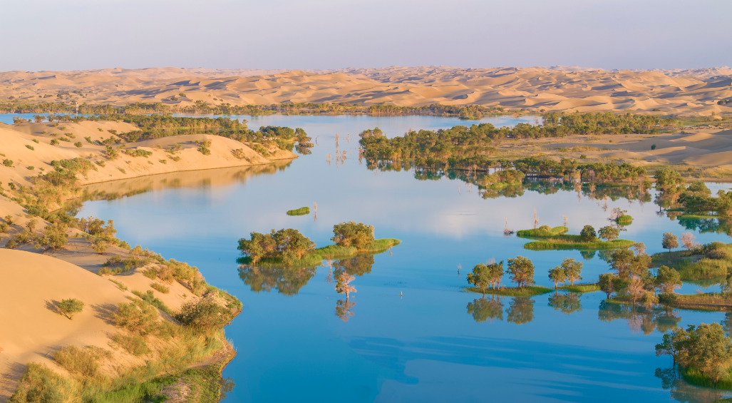 水中胡杨倒映蓝天,金黄与碧水交织成画