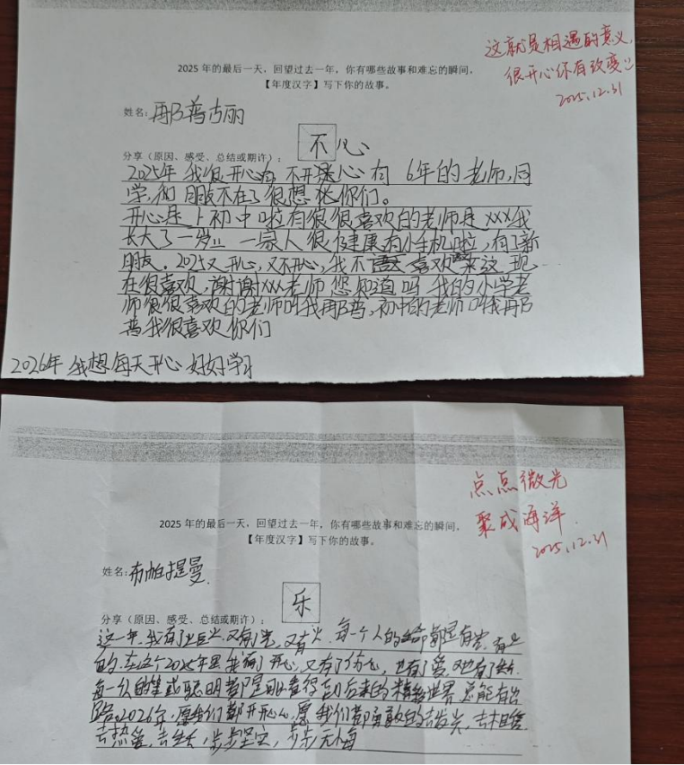 我仔细观察,找她谈心谈话,分析作业出错的原因。我发现她的基础非常薄弱,这导致了她对语文这门学科一直没有信心。但她的内心又非常渴望别人的肯定,我抓住她的这种心理,从纠正拼音开始,不断地鼓励她,写小纸条、发奖状、点名表扬……短短几个月,她的进步十分突出。从原来上课回答问题的扭扭捏捏到现在的自信满满;漏洞百出的作业也焕然一新;每当我上课看向她,她总以认真的眼神回应我。在2025年的年度总结中,她写到:原来我不喜欢语文,来到初中现在很喜欢,谢谢您老师……2026年我想每天开心,好好学习。